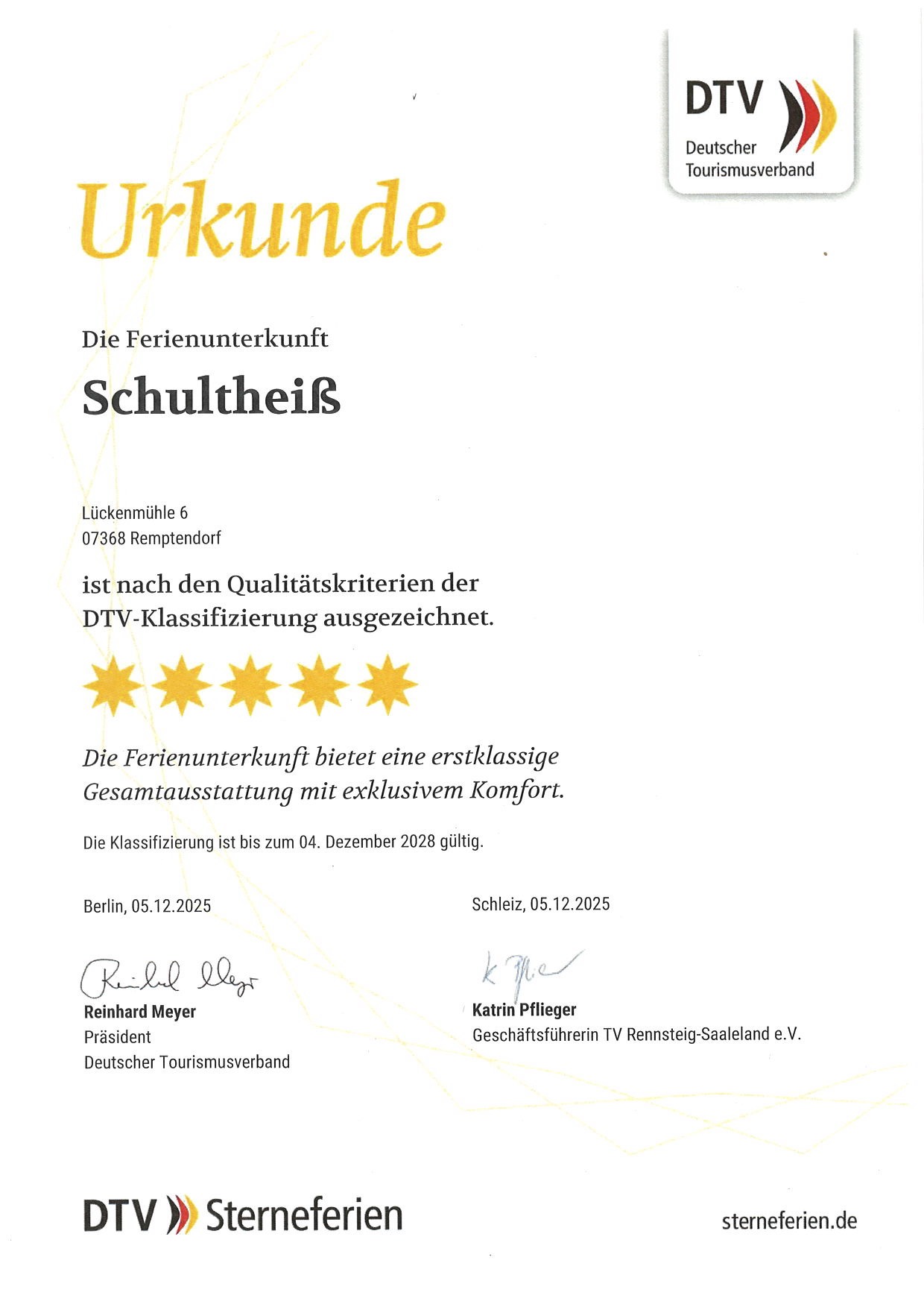 Die Ferienwohnung „Schultheiß“ erhielt erneut die Auszeichnung mit fünf Sternen.
